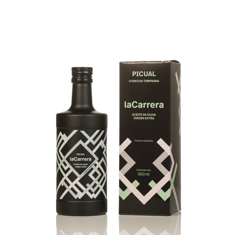 Estuche de cartón con una botella de cristal de Aceite de Oliva Virgen Extra "La Carrera" cosecha Temprana extraído de aceitunas de variedad picual de nuestros cooperativistas. Recogido en el mes de Octubre, este aceite proviene de aceitunas verdes seleccionadas previamente por nuestro departamento técnico bajo estrictos controles de calidad. CAMPAÑA 2025/2026